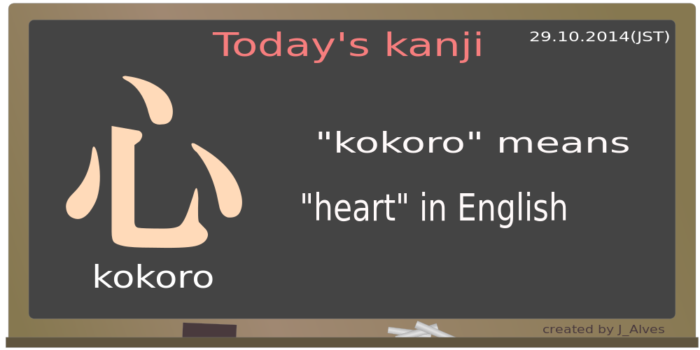This features a blackboard with the word "kokoro" written on it. This word is pronounced as "kokoro" and means "heart" in English. The board also has an arrow pointing to the word, indicating its meaning. The word is displayed prominently on the board, making it easy for viewers to understand.