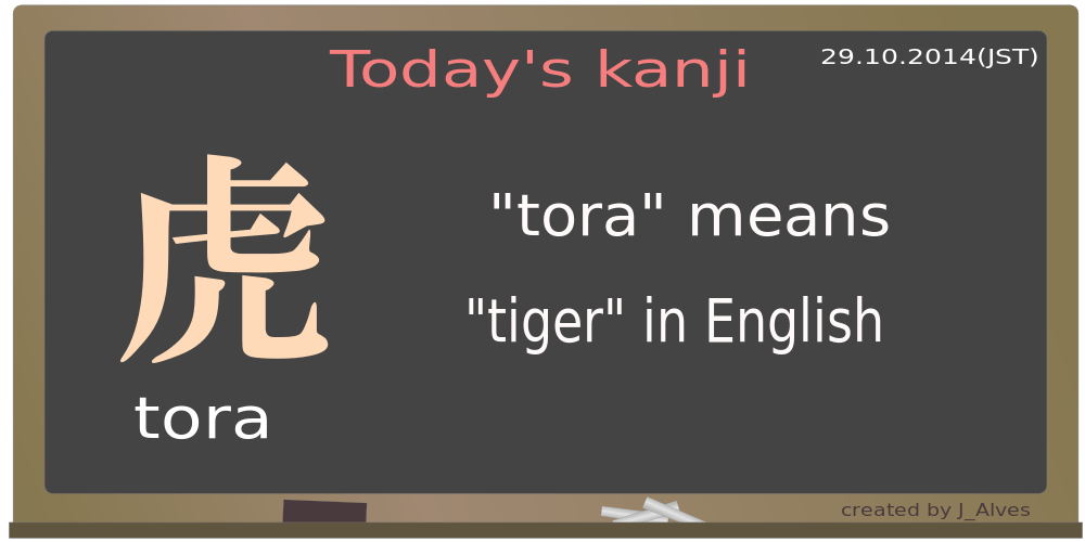 This features a chalkboard with the word "tora" written on it in kanji. Below the kanji, there is an English translation of the word, which means "tiger." The board appears to be used for teaching purposes or as a visual aid for learning Japanese. The presentation of the kanji and its English translation makes it easy for viewers to understand the connection between the two languages.