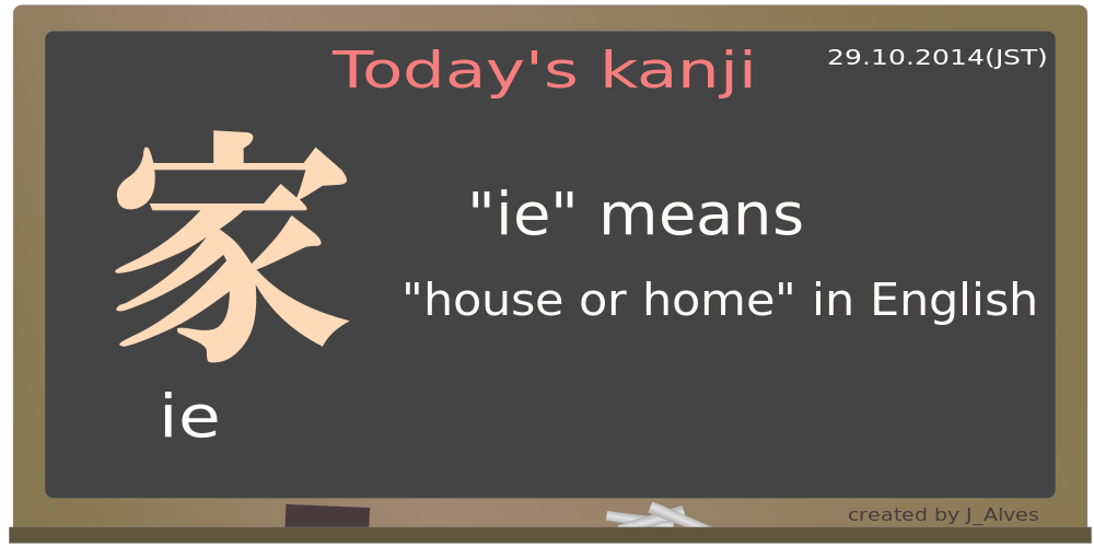 This features a chalkboard with Japanese characters written on it. The characters are arranged in such a way that they spell out the word "ie" which is pronounced as "house or home" in English. This message is displayed prominently on the board, making it an interesting and informative piece of artwork.