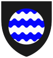 This features a black and blue shield with a white circle in the center. Inside the circle, there is an intricate design of waves or ripples that are blue and white. This unique pattern gives the shield a distinctive appearance. The overall color scheme of the shield consists of black for the background and blue and white for the central design.