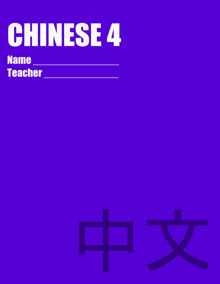 This features a purple book with white text on the top left corner that reads "Chinese 4." Below this, there is an Asian character written in black and white. The book appears to be a study aid for learning Chinese, possibly focusing on the name or teacher aspect of the language.