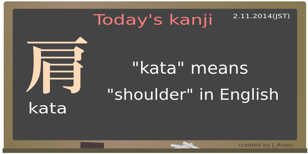 This features a blackboard with Japanese characters written on it. The main character is the kanji for "kata," which means "shoulder" in English. Below this character, there are additional words that explain its meaning further. The board appears to be used as an educational tool or reference material for learning and understanding the language.