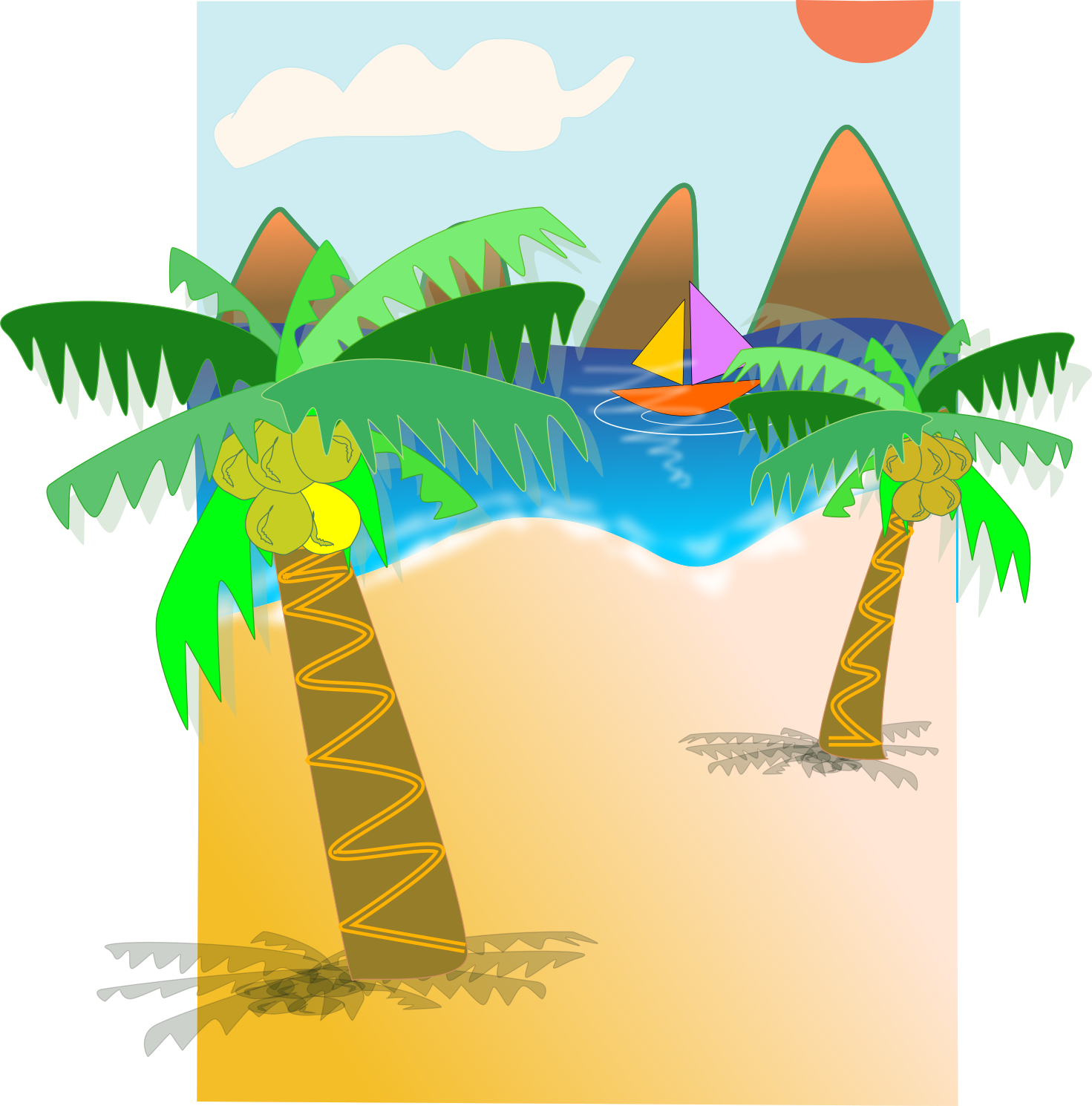 This features a beach scene with two palm trees in the sand. There is a sailboat floating on the water, and mountains can be seen in the background. The sky is light blue with a single white cloud in it, adding to the serene atmosphere of the scene. An orange sun is also visible, casting its warm glow over the beach and ocean. This colorful illustration captures the essence of a relaxing day at the beach, surrounded by nature's beauty.
