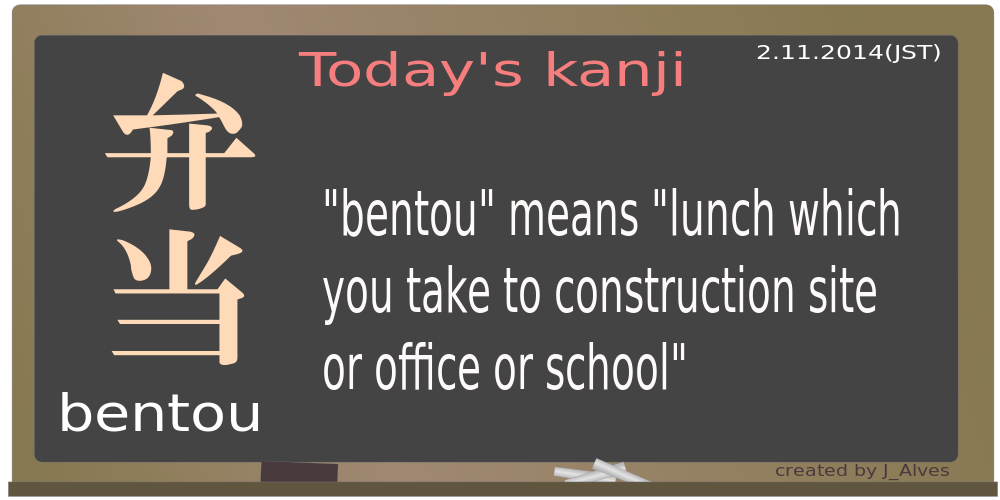 This features a sign written in Japanese, which reads "Today's Kanji" and is accompanied by an illustration of a blackboard. The sign also includes the word "bentou," which is pronounced as "ben-to." Bentou refers to a meal that one takes with them to work or school, typically consisting of a variety of food items packed in a container. In Japan, it is common for people to purchase bentou from convenience stores on their way to various destinations such as construction sites, offices, or schools. The sign serves as an educational tool to help learners familiarize themselves with the Japanese language and culture.