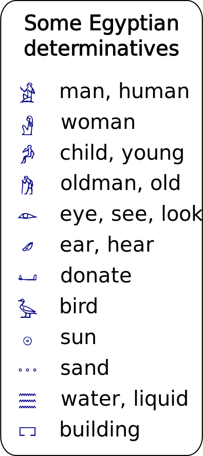 This features a list of Egyptian determinatives, which are symbols used in the ancient Egyptian language. These symbols have definitions on their right side and some of them have multiple meanings. There are several different symbols displayed, each with its own unique appearance. Overall, this image showcases an interesting aspect of ancient Egyptian culture through these symbols.