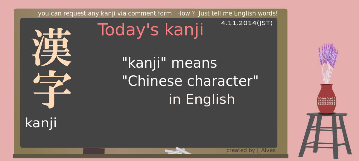 This features a chalkboard with an illustration of a blackboard on it. On the board, there is a lesson about Kanji or Chinese characters written in English. Above the board, there are several Japanese characters that read "Today's Kaji" and "Kanji means . . . .". The chalkboard is placed next to a table with a vase on it.