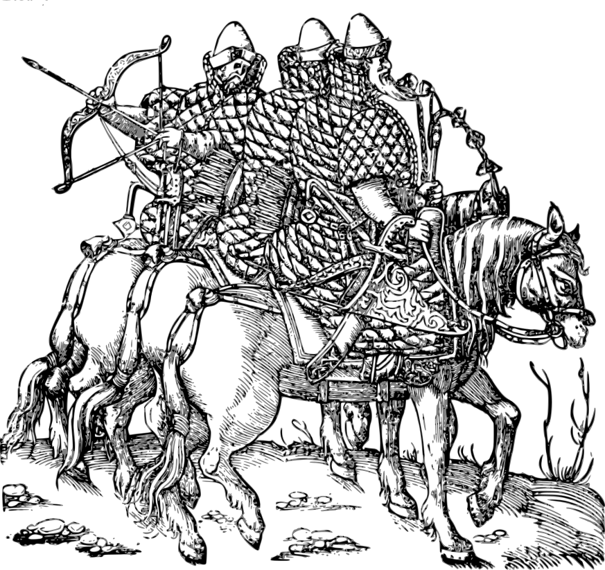This features a black and white illustration of three soldiers in armor, each riding on the backs of white horses. They are all dressed in medieval-style clothing, with one soldier wearing a helmet for protection. The horses appear to be carrying bows and arrows, suggesting that they might be archers or knights from an earlier time period. The scene is reminiscent of a historical battle or a fantasy tale, where the soldiers are ready to engage in combat or embark on a journey together.