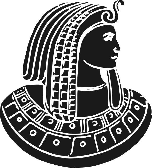This features a black and white drawing of an Egyptian pharaoh, with the head prominently displayed. The pharaoh is wearing a headdress, which includes a crown adorned with intricate designs. The face of the pharaoh appears to be looking off into the distance, giving the impression that they are observing something beyond the frame of the image. The drawing captures the essence of ancient Egyptian culture and history, showcasing the artistic style and craftsmanship from that time period.