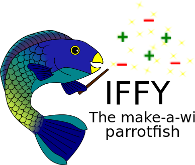 This features a colorful fish with a wand in its mouth, standing on the word "Iffy." This whimsical creature appears to be a parrotfish, as it is described. Above the fish, there are several stars and a wand, adding an element of magic or fantasy to the scene. The combination of the fish's unique appearance and the magical elements creates a playful and imaginative atmosphere in this image.