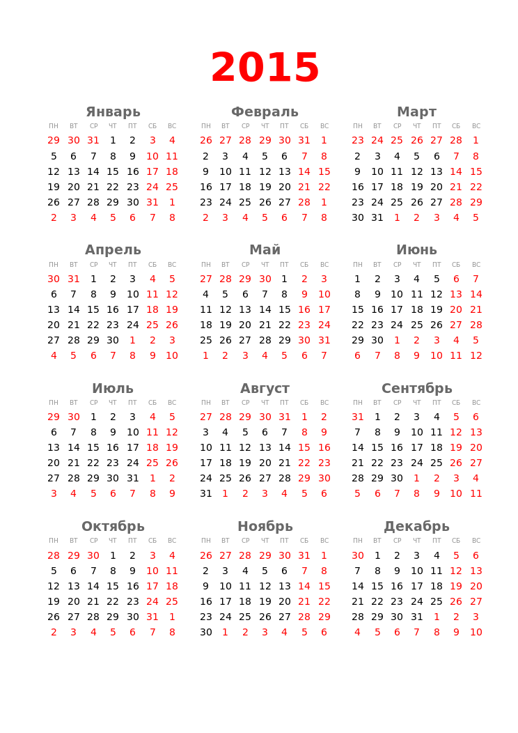 This displays a calendar for the year 2015, written in Russian. It is a red and white color scheme with the numbers and days of the week clearly visible. The calendar has a total of twelve months, each with its corresponding number of days. The first month starts on January 1st, followed by February, March, April, May, June, July, August, September, October, November, December, and finally ending in January again. Each day is marked with a red dot, indicating the date.
