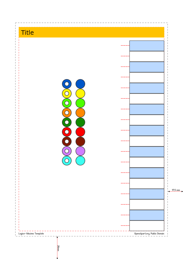 This displays a template for Logico Maximo task cards. It is designed to be used with A4 paper, providing a clear and organized space for users to complete their tasks. The template features a row of circles, each containing different colored balls, which are likely used as markers or labels for various categories or statuses within the task management system. Additionally, there is a line that runs horizontally across the image, possibly indicating a divider between sections or providing a reference point for alignment purposes. Overall, this template offers a practical and visually appealing way to manage tasks and keep track of progress.