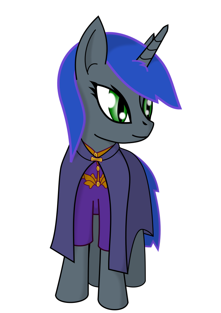 This features a cartoon character, possibly a pony or a unicorn, wearing a purple cape and standing in front of a brown background. The character has blue eyes and is adorned with a necklace. The outfit appears to be a mix between a wizard's robe and a princess dress, giving the character an enchanting appearance. The overall scene exudes a sense of magic and fantasy, making it an interesting visual for viewers who enjoy such themes.