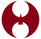 This features a red and white logo that is shaped like an arrow. It has three distinctive points, making it resemble a sharp two-edged axe. The design of the emblem gives it a unique and eye-catching appearance. This particular symbol could be associated with a specific organization or event, as it stands out against its red background.