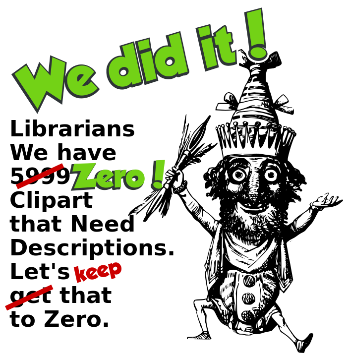 This features a cartoon character with a crown on its head, holding a sign that reads "We Did It! Librarians Have 6999 Zero! Clipart That Needs Descriptions. Let's Keep It To Zero." The character appears to be celebrating the accomplishment of reaching zero descriptions. The cartoon is set against a green and white background, with the text in bold letters.