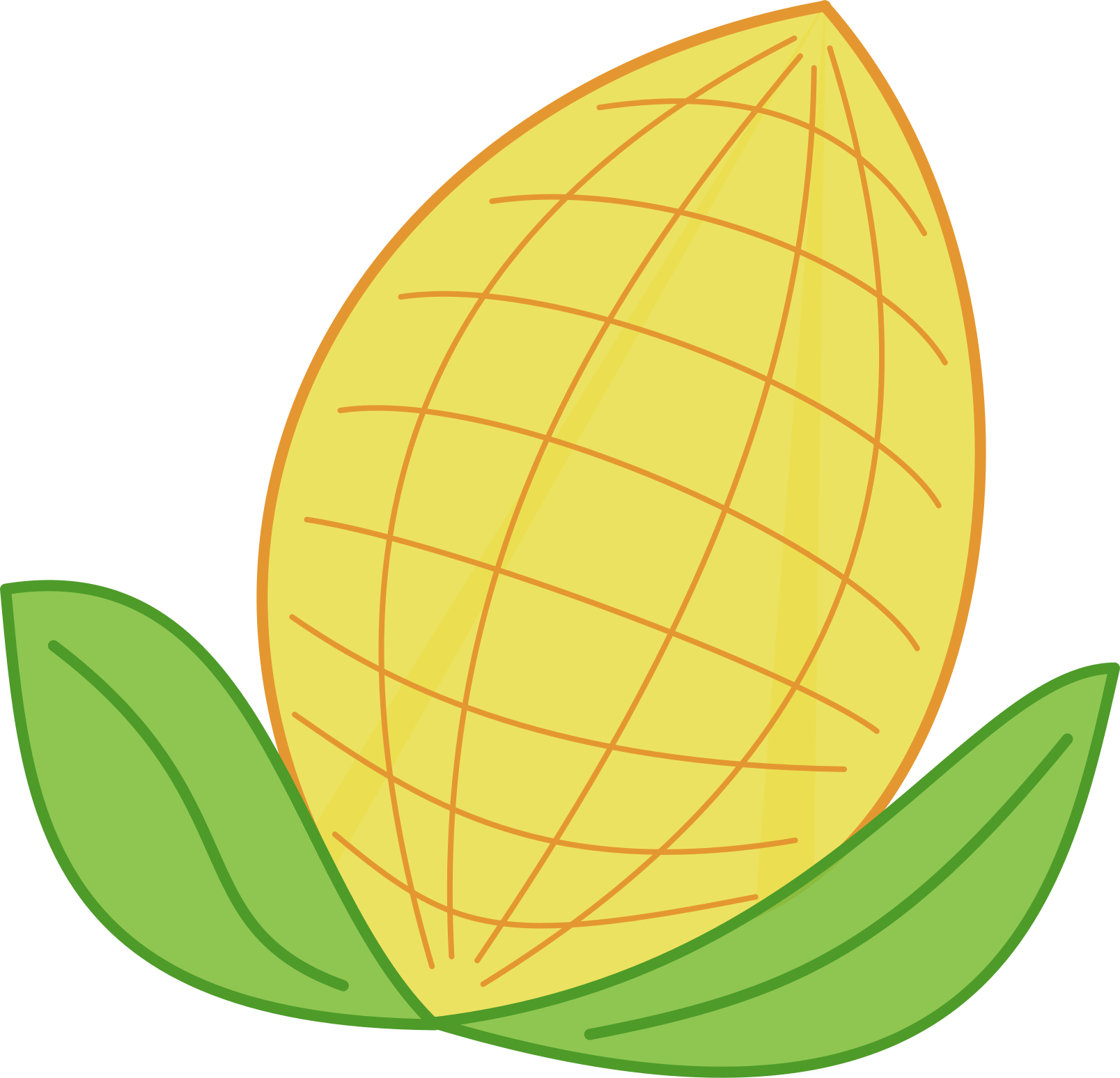 This features a large, bright yellow corn on the cob with two green leaves at its base. The corn is prominently displayed in the foreground of the picture, taking up most of the frame. The vibrant color and distinct shape of the corn make it an eye-catching focal point within the image.