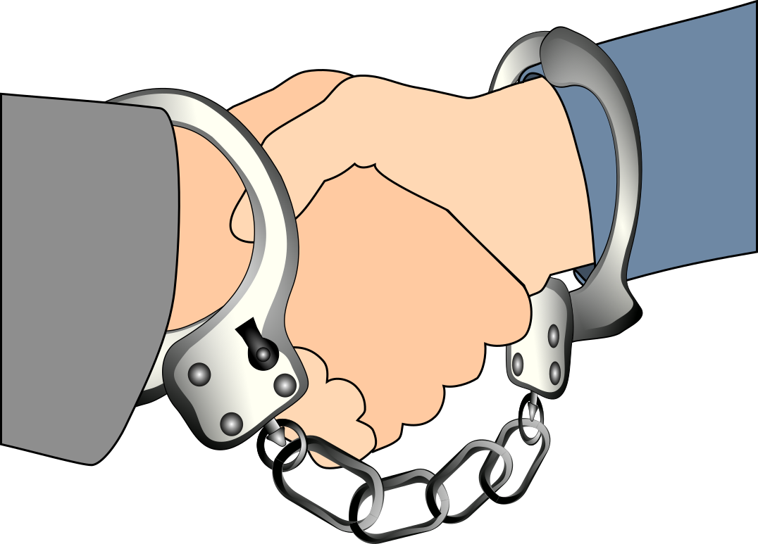 This features a handshake between two people, both of whom are wearing shackles on their wrists. This unusual scene is depicted in a cartoon-like style with the hands and chains being the main focus of the picture. The handshakes appear to be a symbolic gesture, possibly representing a bond or agreement despite the challenging circumstances. The image may evoke feelings of empathy or curiosity about the context behind this unique interaction between two individuals.