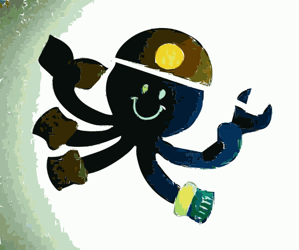 This features a cartoon octopus wearing a brown helmet and smiling. It is holding a wrench in its hand, giving the impression that it might be fixing something or performing some kind of maintenance work. The octopus's design is reminiscent of an old-fashioned worker's uniform, adding to its charm and character.