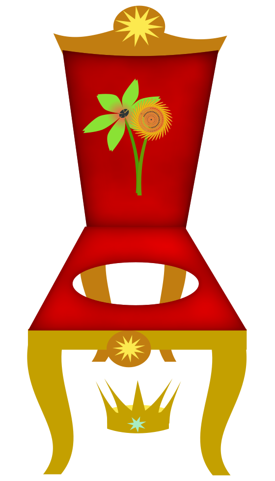 This features a red chair with a hole in the middle, adorned with a floral design. Above the chair is an ornate crown, adding to its regal appearance. The chair appears to be made of wood and has a gold trim around it. In addition to the chair, there are two flowers on display - one located near the top left corner and another in the middle-left area of the image. These decorative elements contribute to the overall artistic and elegant presentation of this unique piece of furniture.