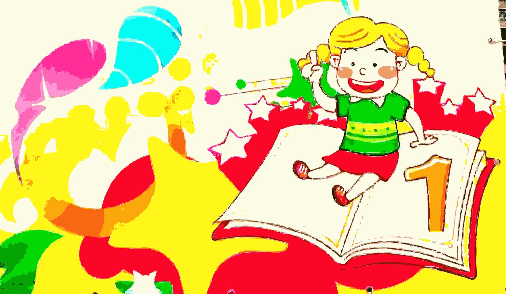 This features a colorful scene with a little girl sitting on top of an open book. She is wearing a green shirt and has her hair in pigtails. The book appears to be the main focus of the scene, taking up most of the space from left to right. In addition to the girl and the book, there are several other elements present in the image. There are three people visible on the left side of the frame, with one person closer to the top left corner, another near the middle-left area, and the third person further down towards the bottom left. A clock can also be seen in the upper right part of the scene, adding a sense of time to the overall composition.