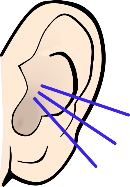 This features a close-up of an ear with three blue lines pointing towards it. These lines represent the sound, indicating that they are likely drawn to show the direction of the sound waves entering the ear. The ear itself is beige in color and appears to be a part of a human head. This drawing or illustration could potentially be used for educational purposes or as an artistic representation of the inner workings of the human body.