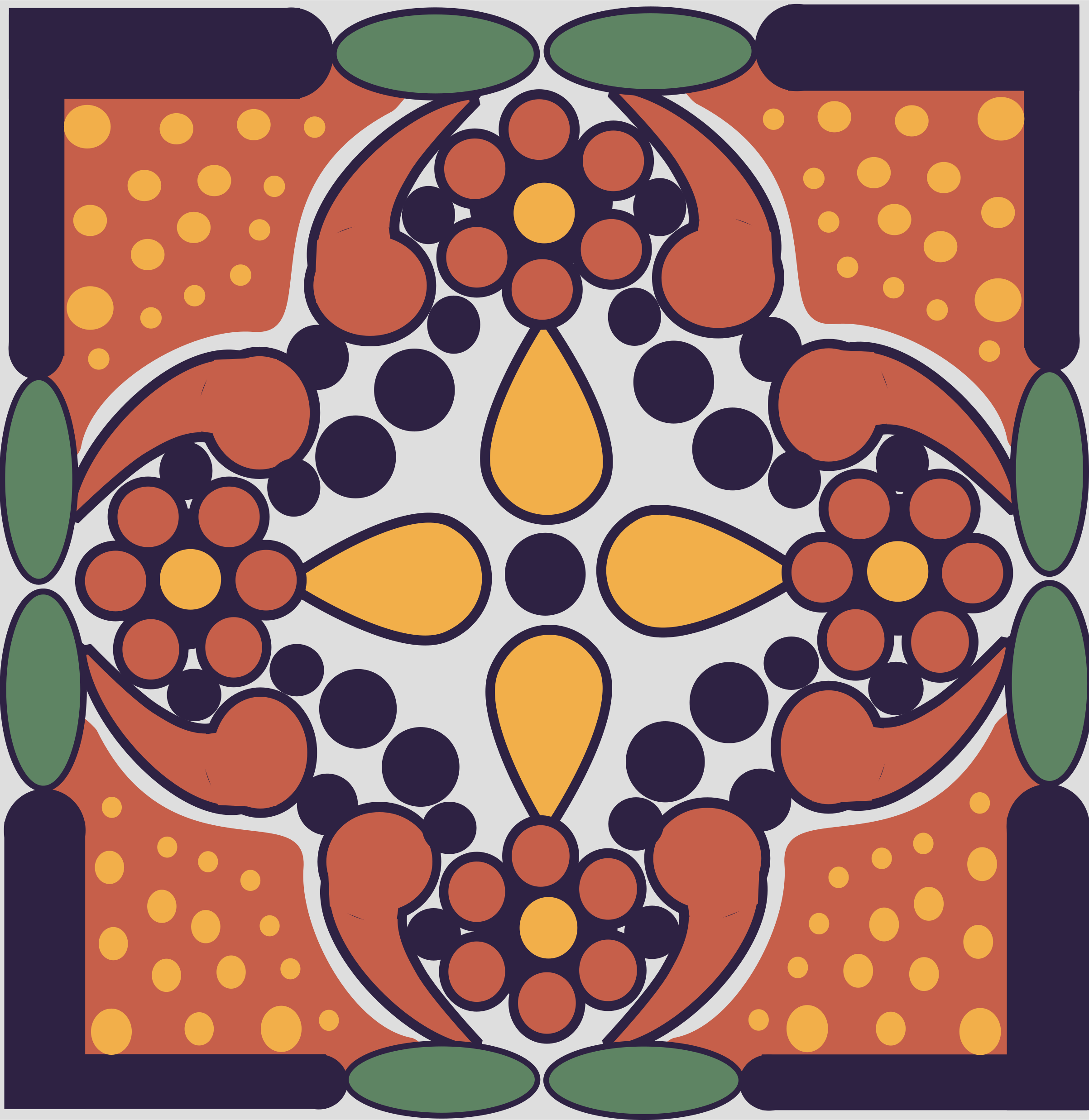 This features a colorful tile design with an orange background and yellow dots. In the center of each tile, there is a yellow circle surrounded by small circles. These tiles are arranged in a circular pattern, creating a visually appealing display. The overall effect is reminiscent of a flower pattern, with the vibrant colors and intricate design elements coming together to create an eye-catching piece of artwork.