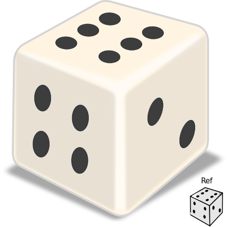 This features a close-up of a white die with black dots on it. There are six sides to the die, and three of them have numbers written on them: 6, 2, and 4. The other three sides are blank. In the bottom right corner, there is a smaller die with the word "Ref" written above it. This illustration could be used for various purposes such as in games or educational materials to represent a standard six-sided die.