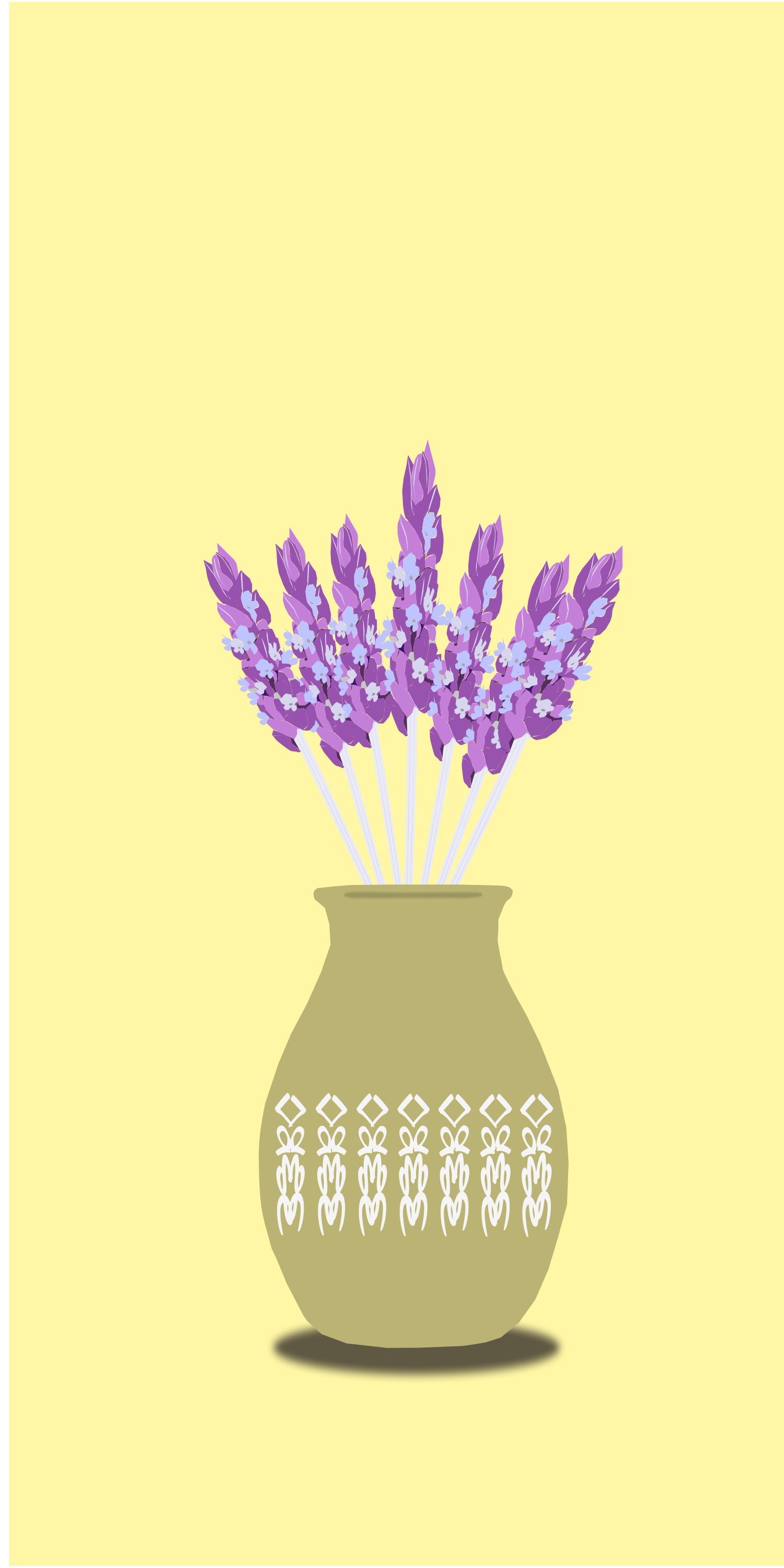 This features a vase filled with purple flowers, which are lavender in color. The vase is placed on a yellow background, creating an appealing contrast between the two colors. There are several stems of flowers inside the vase, adding to its visual appeal. The overall scene exudes a sense of freshness and natural beauty, making it an attractive display for any setting.