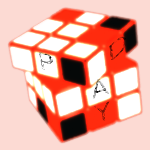 This features a large red Rubik's cube with the word "Pay" written on it. The cube is made up of multiple smaller squares, each containing letters or numbers. The word "Pay" is displayed in black and white, contrasting against the bright red background of the cube. This unique design makes for an interesting and eye-catching display.