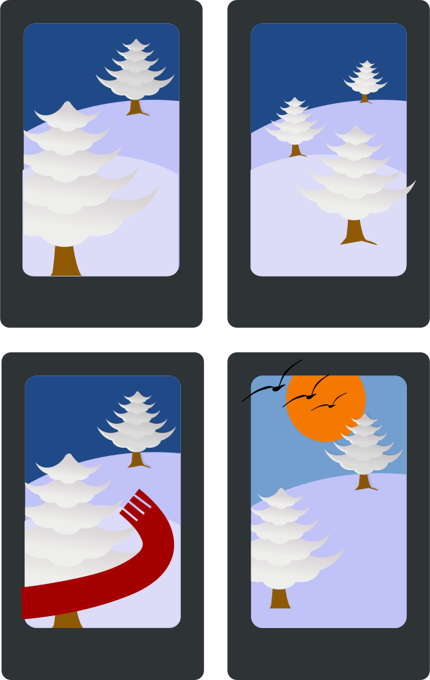 This features a collection of four cards, each depicting a snowy scene with trees. These cards are part of the Japanese card game Hanafuda, which consists of 48 cards in total. Each card has a unique design and represents a specific season or theme. In this case, the cards represent winter, as evidenced by the snow-covered trees on each card. The cards are displayed side by side, showcasing their similarities while also highlighting the differences between them.