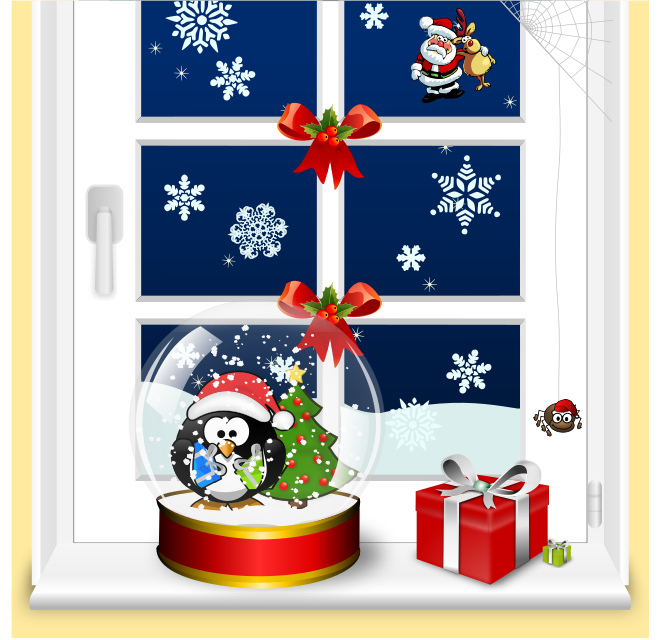 This features a snow globe with a penguin and Christmas tree inside of it. The snow globe is placed in front of a window pane, which has a blue background. Next to the snow globe, there is a red gift box that adds a festive touch to the scene. Above the snow globe, there are two cute little cartoon characters, one on the left and another on the right side, adding more charm to the display. The overall atmosphere of the image suggests a cozy and warm holiday setting.