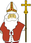This features a cartoon depiction of an old man dressed in a red robe and holding a staff with a golden cross on top. He is wearing a white beard and hair, giving him the appearance of an elderly priest or monk. The character appears to be standing confidently, possibly as a symbol of faith or spiritual guidance.
