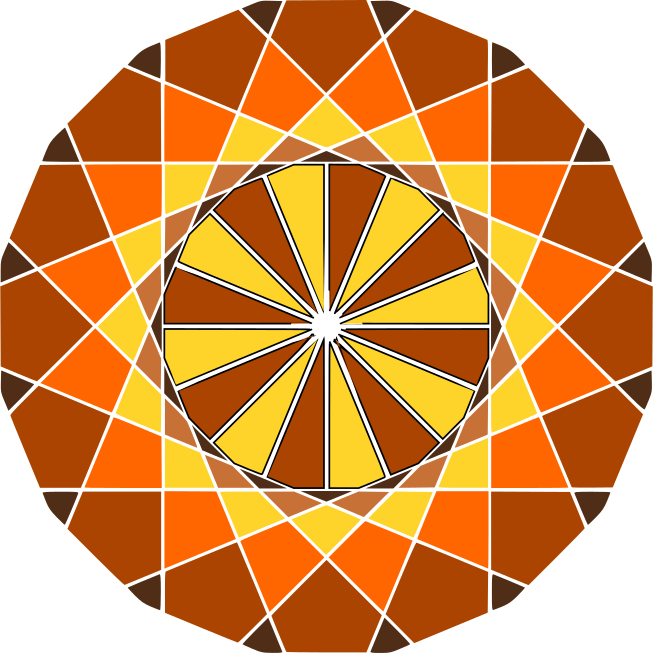This features a round geometric circle with many different colored shapes, predominantly orange and yellow. These shapes are arranged in various patterns throughout the circle, creating an intricate and visually appealing design. In the center of the circle, there is a large orange and brown shape that stands out among the other shapes. The overall composition of the image gives off a sense of harmony and balance, with each shape complementing the others to create a cohesive and eye-catching pattern.