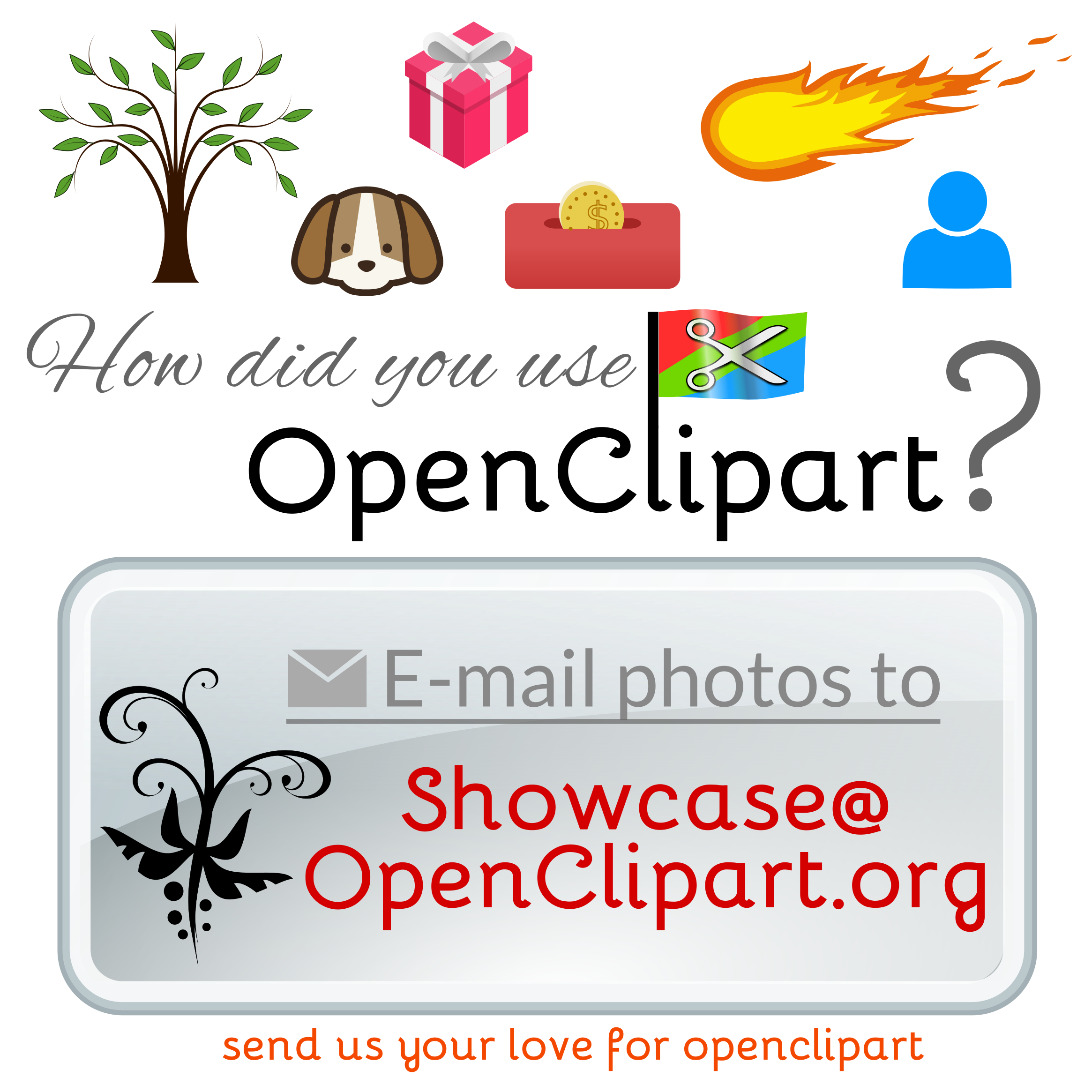 This features a collection of icons and images, including a dog, a tree, a knife, a fire, and a person. These elements are arranged in various positions throughout the scene, creating an interesting visual display. Above this arrangement, there is a question asking "How did you use Openclipart?", inviting users to share their experiences with the platform. The image also includes a link to send photos of one's usage of Openclipart to showcase@openclipart.org.