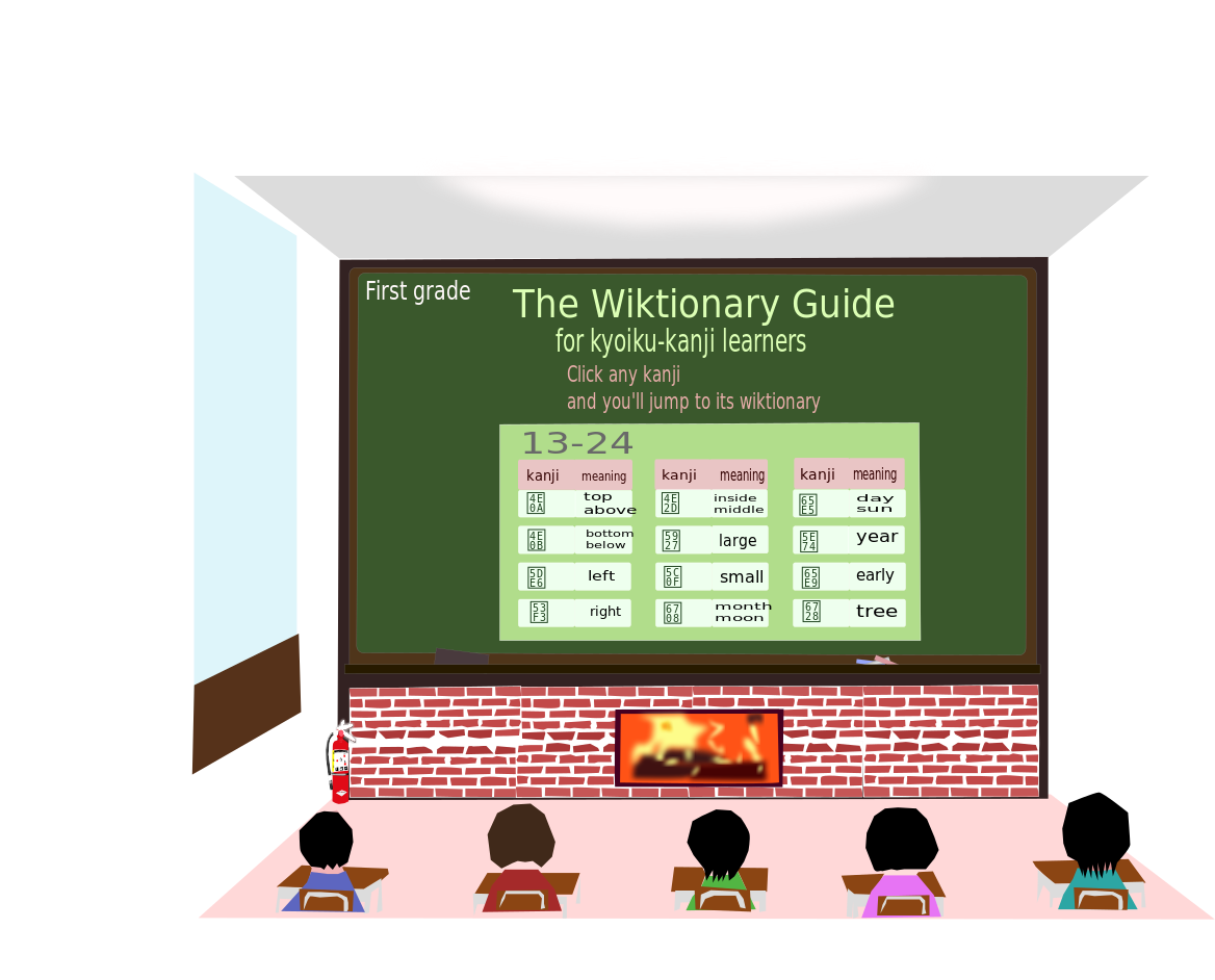 This features a classroom setting with several students sitting in chairs, attentively watching a large screen. The screen displays information about the Wiktionary guide for English learners. There are multiple chairs placed around the room, some of which are occupied by students while others remain empty. A fireplace can be seen in the background, adding warmth and ambiance to the classroom environment. In addition to the students and screen, there is a clock on the wall, likely used for keeping track of time during lessons or breaks. The overall atmosphere suggests an educational setting where students are learning about the Wiktionary guide for English learners.