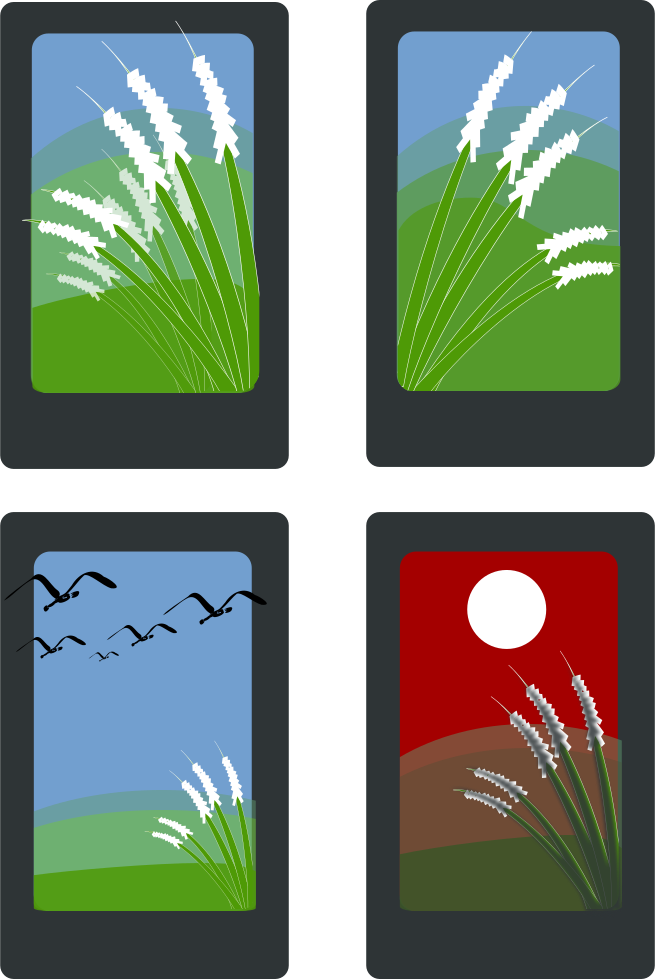 This features a collection of four different cards, each showcasing unique artwork. Each card is framed with a window-like design and displays a picture of tall grass or wheat on the inside. The cards are arranged in a square formation, creating an appealing visual display. The first card to the left has a picture of tall grass, while the second card to the right also features this artwork. The third card is different from the others, as it displays a picture of wheat instead of tall grass. Lastly, the fourth card on the far right showcases another unique image of wheat. Overall, these cards create an interesting and visually engaging presentation.