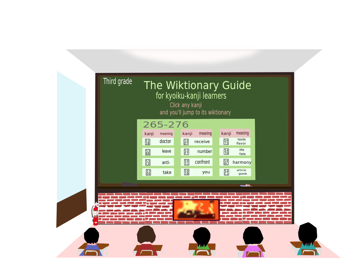 This features a classroom setting with several students sitting in chairs, attentively watching a screen. On the screen, there is an educational presentation about kanji, which appears to be part of a wiktionary guide for kyoiku kanji. This guide is designed to help Japanese children learn kanji but can also serve as a resource for non-native speakers looking to improve their knowledge of the language. The students are seated in various positions around the room, with some closer to the front and others further back. Overall, it seems like an engaging learning environment focused on kanji education.