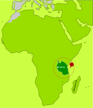 This is a map of Africa, with the continent's borders and various countries labeled. In the center of the map, there is an arrow pointing to a small green circle that reads "Mafia Island." Mafia Island is located in Tanzania and has a population of around 40,000 people. The name "Mafia" is said to have been derived from either Swahili or Arabic, meaning "a healthy dwelling-place" or "archipelago," respectively. This island attracts tourists for scuba diving, game fishing, and relaxation on its sandy beaches.
