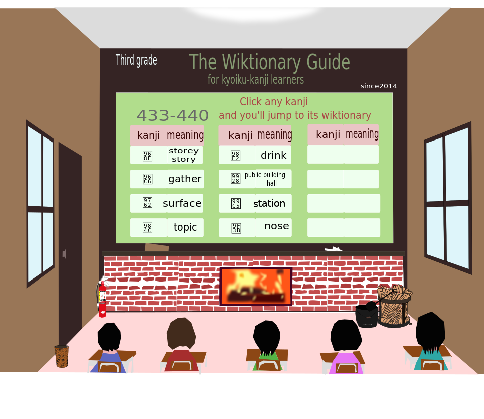 Tags: wiktionary, chinese, chinese character, hanzi, hanja, kanji, storey, story, gather, surface, drink, hall, station, nose, education, school, learning, teaching, third grade, word, vocabulary, kid, child, classroom