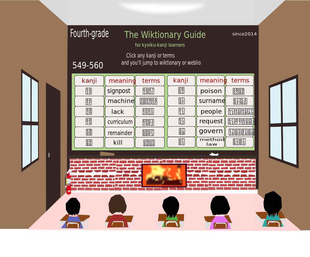 This features a classroom setting with several students sitting on chairs, attentively watching the teacher. On the wall in front of them is a large display that reads "The Wiktionary Guide." This guide appears to be an educational tool for learning kanji, which are Japanese characters used in writing and reading. The students seem engaged and focused as they learn from this resource.