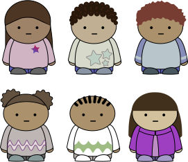 This features a group of six cartoon children, each wearing different outfits and having distinct hair and skin colors. They are all standing next to one another in various poses, creating an interesting visual display. The children appear to be young, with their expressions ranging from neutral to slightly concerned or curious. Their clothing styles vary, showcasing a diverse range of fashion choices that make the image visually engaging and appealing.