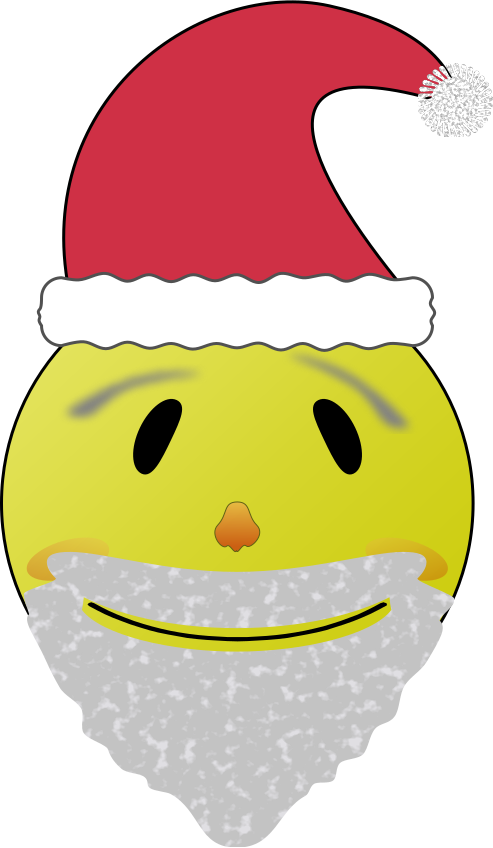 This features a yellow smiley face with a beard and mustache drawn on it. It is wearing a Santa Claus hat, giving the impression of a jolly and cheerful character. The hat has red and white colors, adding to the festive atmosphere. The smiley face appears to be looking at something or someone off-camera, creating an engaging and friendly appearance.