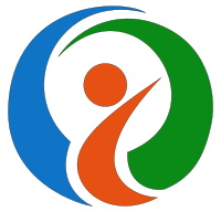 This features a colorful logo that is shaped like a person. This person appears to be walking, as the logo is designed with an orange and blue color scheme. The person's arms are outstretched, giving the impression of movement and action. The overall design of the logo is visually appealing and eye-catching, making it stand out on any background or surface.