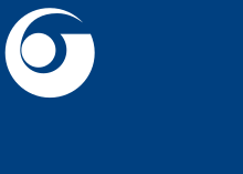 This features a blue and white flag with a logo on it. The flag is displayed prominently in the upper left corner of the picture, covering almost half of the frame. The logo appears to be an emblem or symbol, possibly representing a company or organization. The combination of colors and design elements gives the flag a professional and sophisticated appearance.