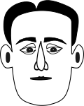 This features a black and white drawing of a man's face. The man has a prominent nose, which is the main focus of the drawing. His eyes are also noticeable, giving him an intense look. The drawing captures the essence of the man's facial features in a simple yet effective manner.