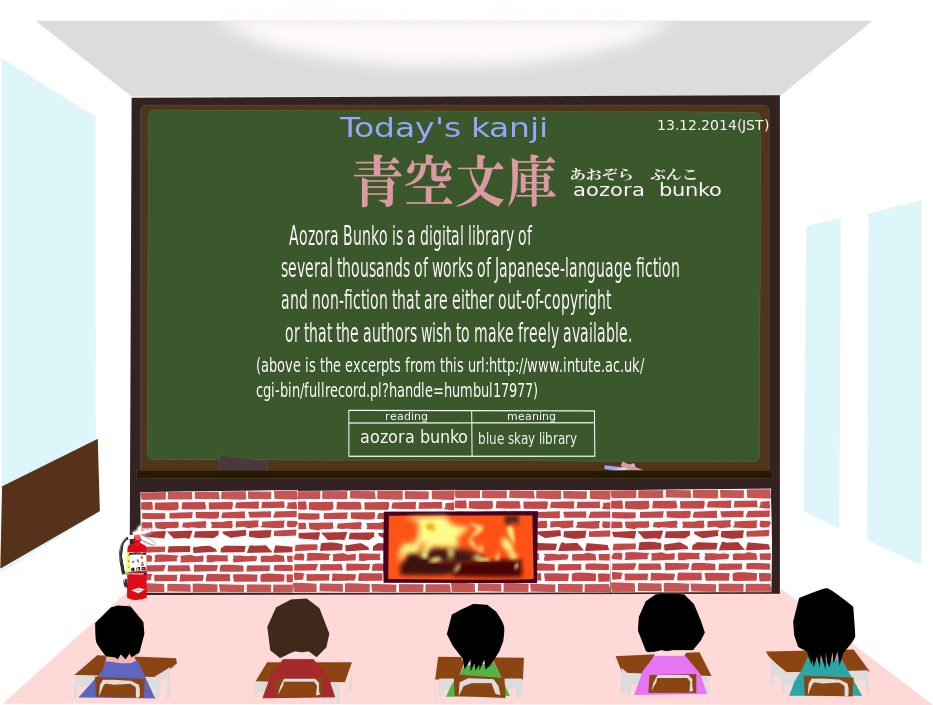 This depicts a classroom setting with several children sitting in chairs, attentively watching a blackboard. On the board, there is an advertisement for Daily Kanji, which appears to be a language learning tool or resource. The children seem engaged and focused on the presentation, possibly learning about Japanese language or culture. The classroom has a brick wall behind the chairs where the students are seated, adding a unique touch to the environment. There is also a fireplace in the room, which could be used for warmth during colder months or as an additional decorative element. The overall atmosphere of the scene suggests that learning and education are taking place within this space.