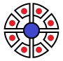 This features a colorful and intricate design, which appears to be an artistic representation of a cross. The cross is made up of multiple circles, each containing red dots. These circles are arranged in various positions around the central blue circle, creating a visually appealing pattern. The combination of colors and shapes gives the image a unique and eye-catching appearance.