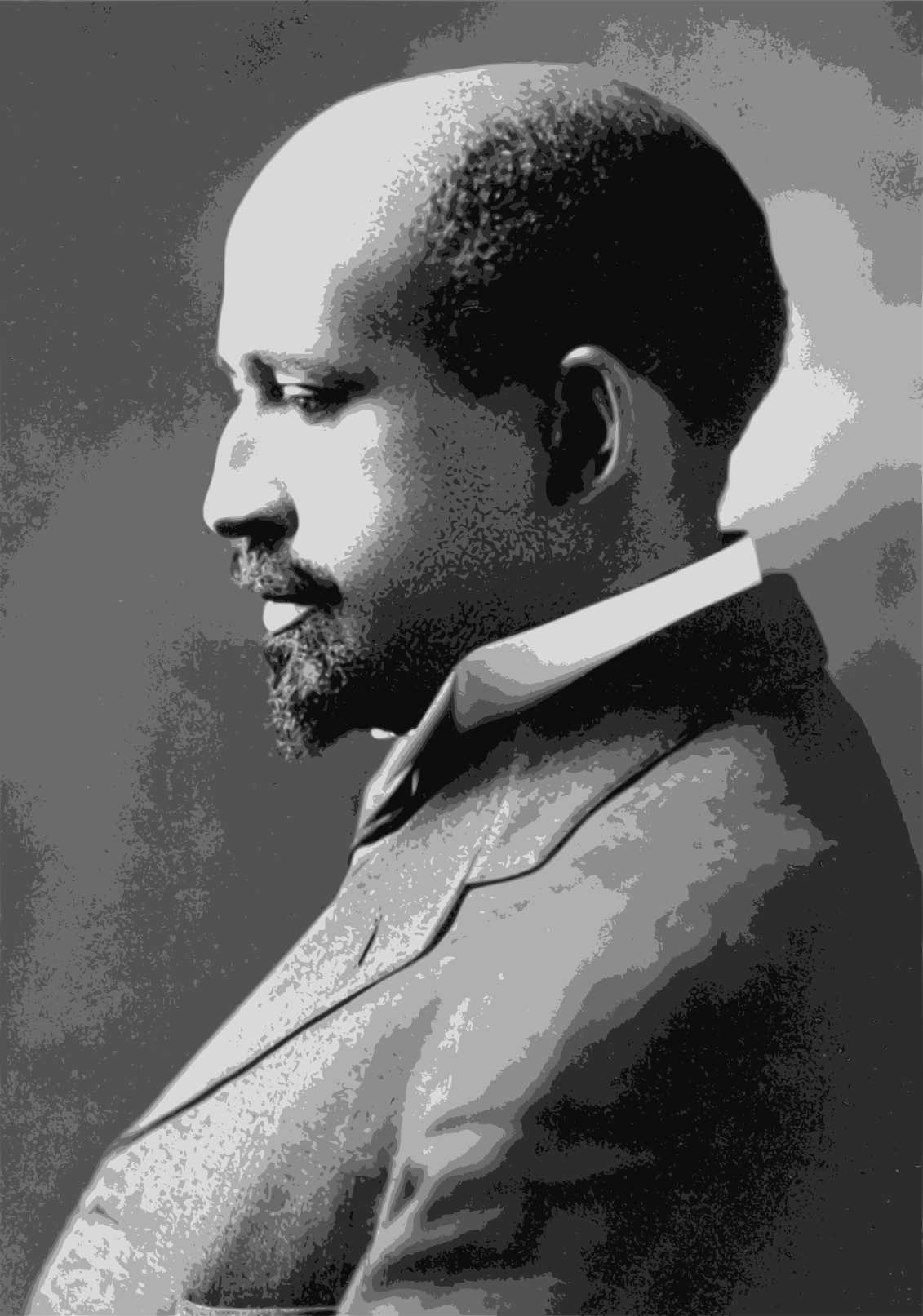 This features a black and white photograph of W. E. B. Du Bois, an American sociologist, historian, civil rights activist, Pan-Africanist, author, and editor. He is known for his significant contributions to the history of America and has become a famous figure in this context. The portrait captures him looking off into the distance with a thoughtful expression on his face. His attire includes a tie, which adds an element of formality to the photograph. Overall, the image showcases Du Bois's intellectual prowess and impact on society during his time.