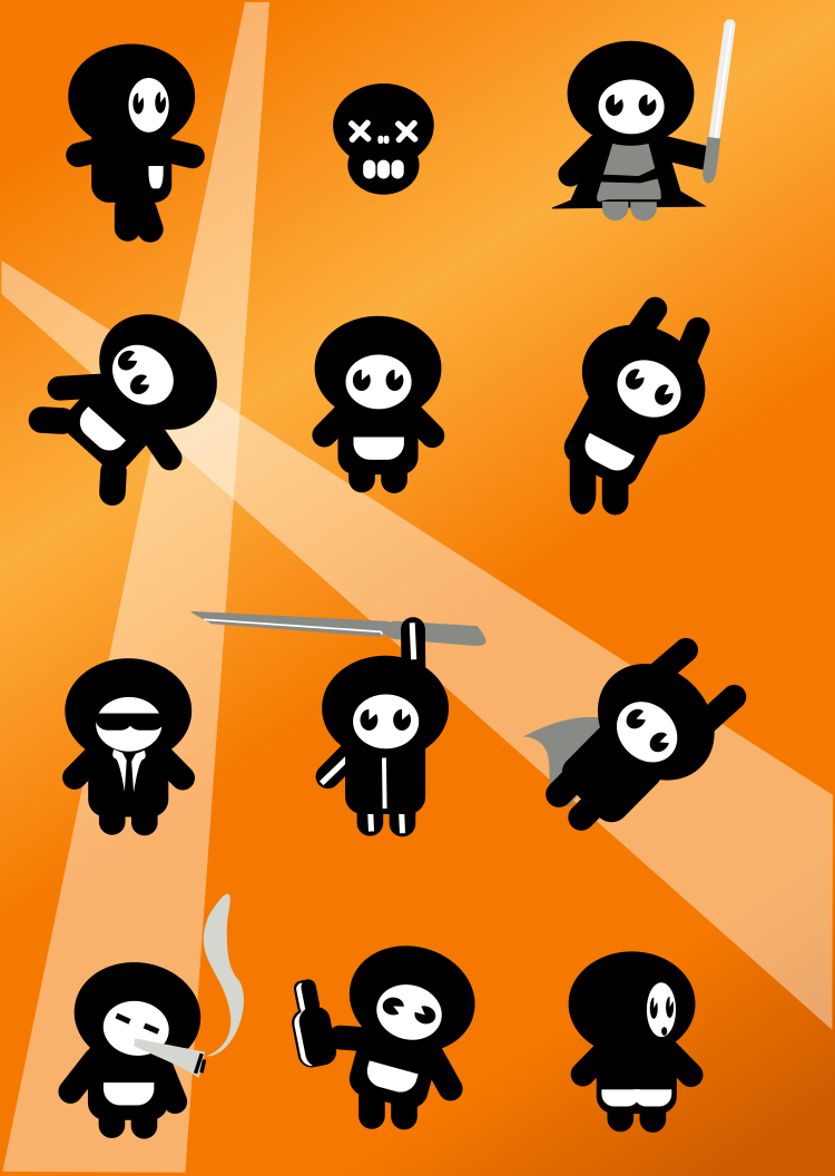 This features a collection of nine small cartoon figures in black and white, each with different poses. They are arranged on an orange background that adds vibrancy to the scene. Some of these characters appear to be wearing ties, while others have swords or other accessories. The arrangement of the figures creates a visually appealing composition, showcasing their unique features and expressions. Overall, this image captures the essence of creativity and artistry through its depiction of these charming cartoon characters.