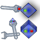 This features a collection of various mechanical and electronic components, including two blue squares with green lights in the center. These squares are surrounded by other smaller objects that appear to be part of an assembly or construction process. There is also a wrench present in the scene, which could potentially be used for tightening or loosening screws during the assembly process. The overall composition suggests a creative and technical environment focused on constructing or repairing electronic devices.