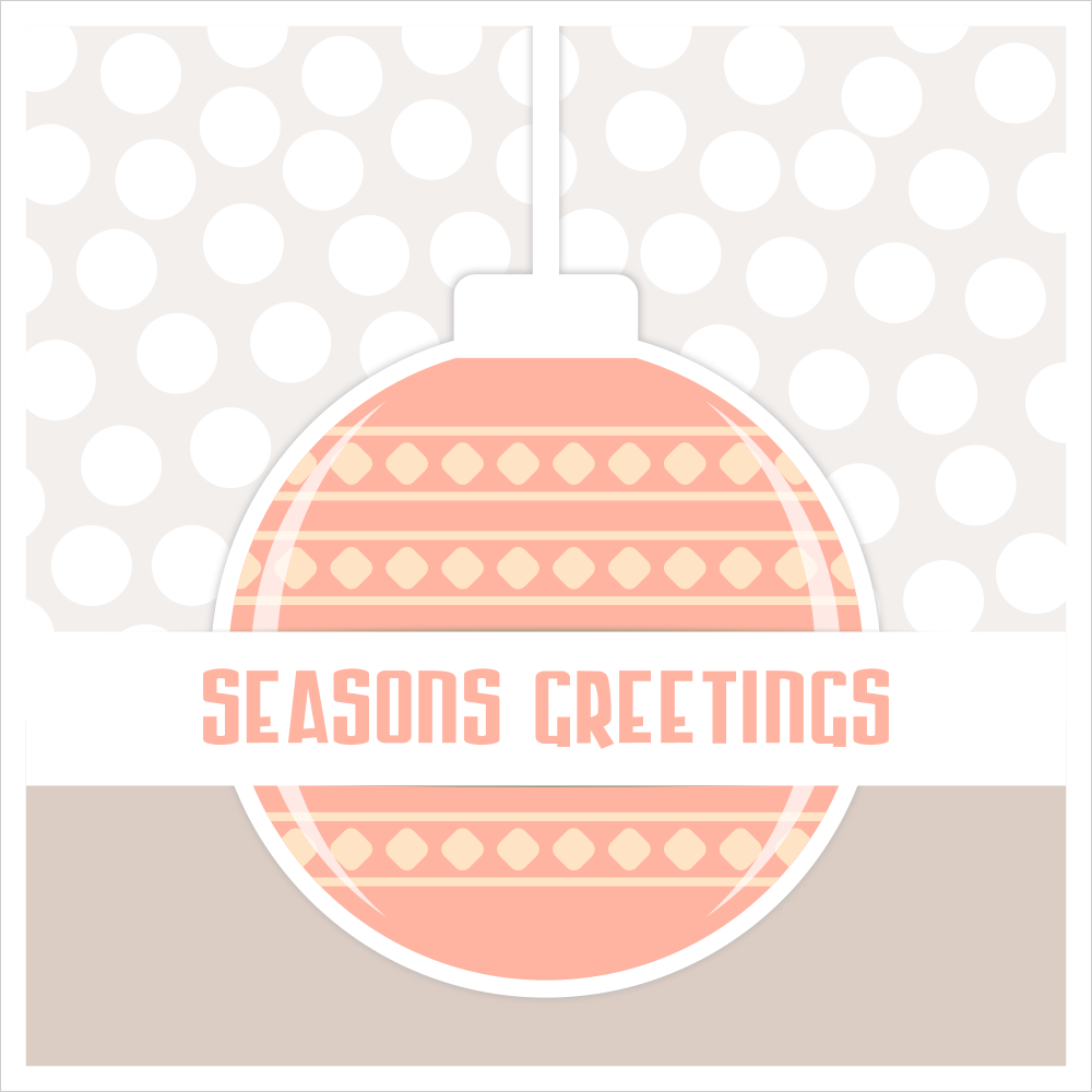 This features a pink Christmas ornament with a white background, which is the main focus of the scene. The ornament has a patterned design and is placed in the center of the image. Above the ornament, there are words "Seasons Greetings" written in bold letters, indicating that this card is meant to be used for holiday greetings. The overall composition of the image creates an inviting and festive atmosphere, perfect for sending season's greetings to friends and family during the holiday season.